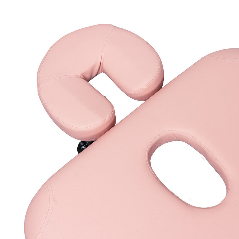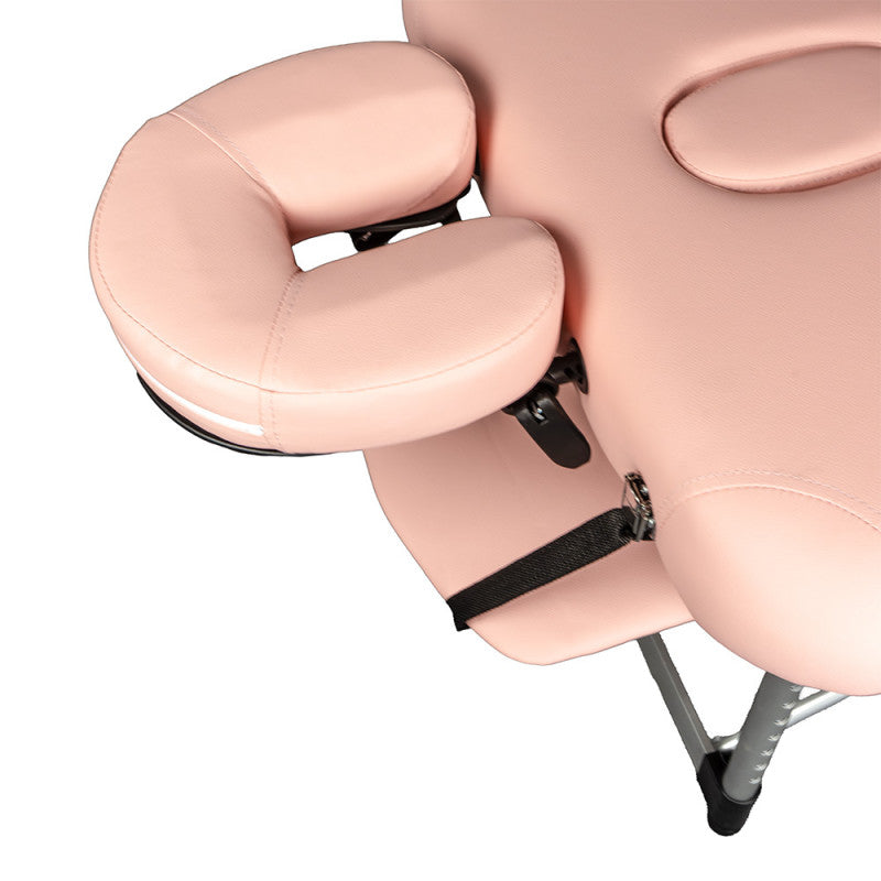Aluminum bed in pink with headrest and arm supports. Lightweight, stable, and comfortable – perfect for tattoo studios or PMU salons.