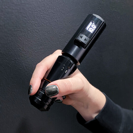 EnGen has three buttons to control the voltage and start the machine with the tattoo battery pack. The set-up buttons are easy to feel even under the cover, so operating the tattoo machine and changing the settings are quickly done. The OLED display offers you all the information you need at a glance. It shows the current output voltage and the power level of the battery.