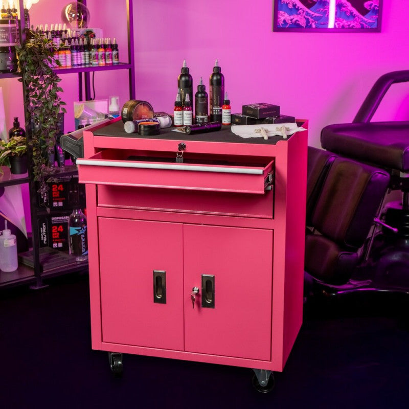 Sturdy metal work station in a vibrant pink color. Perfect for tattoo studios or PMU salons.
