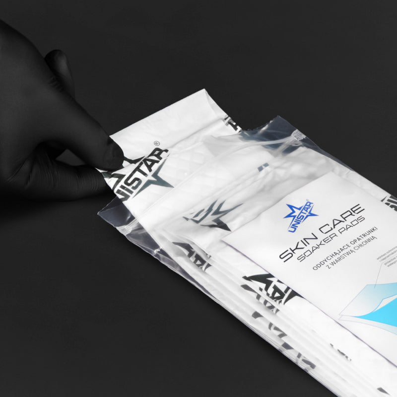 With three layers, Skin Care Soaker Pads are extremely functional and mega-absorbent. The outer layer is waterproof and provides effective protection of the tattoo from the external environment. The middle layer effectively absorbs fluids. While the soft and breathable inner layer guarantees comfort and hygiene for the skin irritated by the tattooing process. With this solution, you can be sure to provide your customers with the highest quality of post-tattoo care.